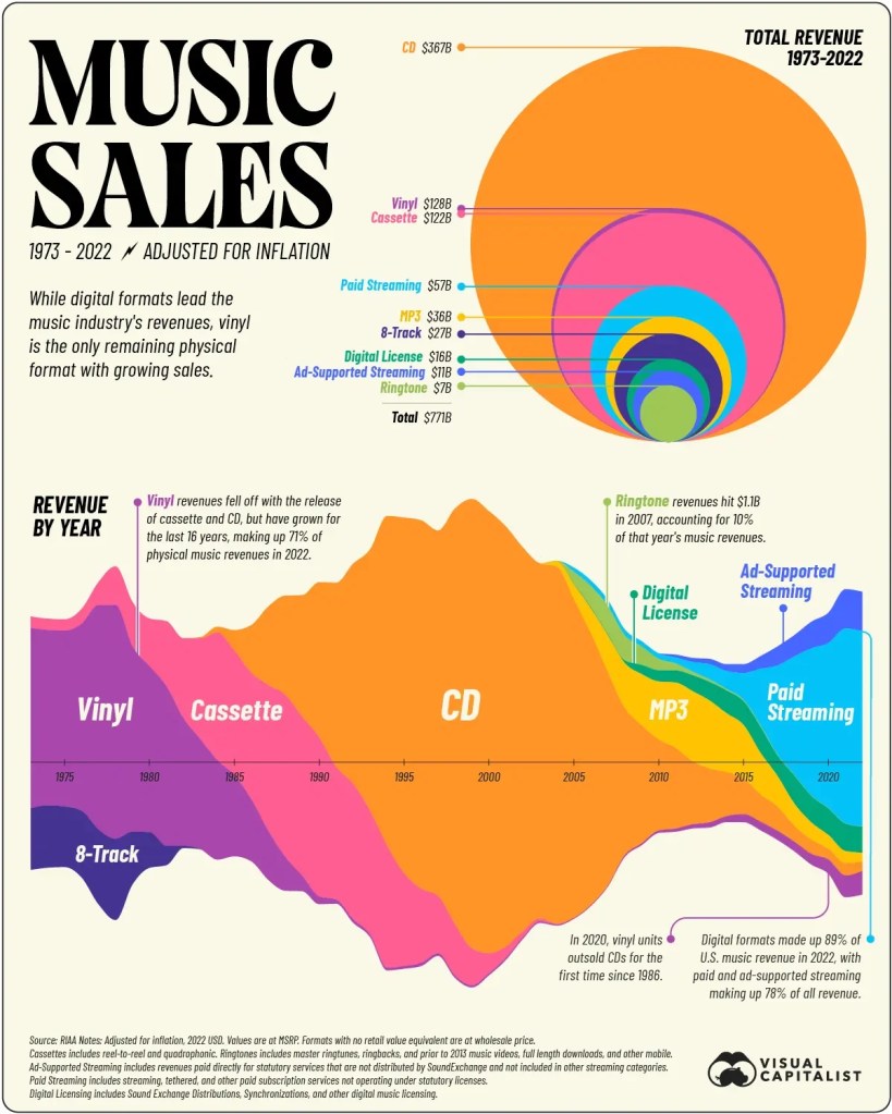 The second infographic was created by Visual Capitalist and covers music sales in the United States from 1973 to 2022. In my opinion, this text-heavy profile is much more visually appealing than the other. It pairs a retro-style header and an italicized body copy with a vibrant range of tones, steering clear of monotonous shapes and lines.
